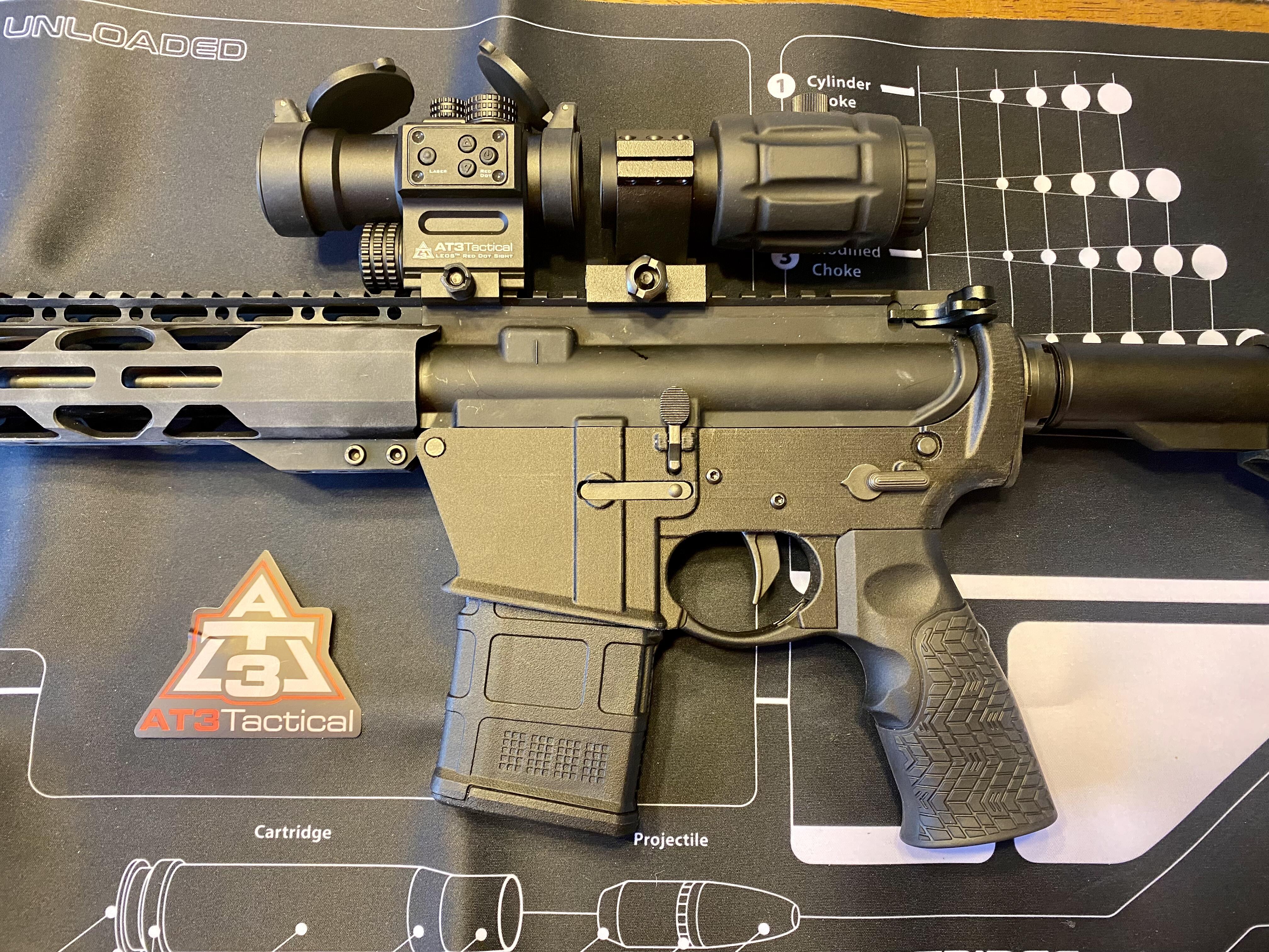 This kit combines the AT3 LEOS Red Dot with Integrated Laser Sight, and the RRDM 3x Magnifier for a versatile, accurate, and durable optic setup.